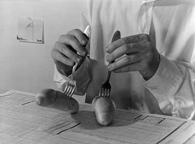 Dance of the rolls is the remake of a performance by Charlie Chaplin in his movie Goldrush (USA 1925). The remake changes fore- and background (financial paper, czech rolls, photo of an empty flag, white shirt), focuses only the "roll-dancing" hands ... more>