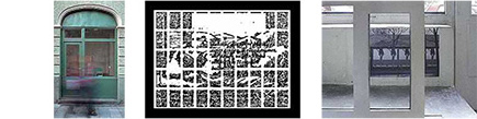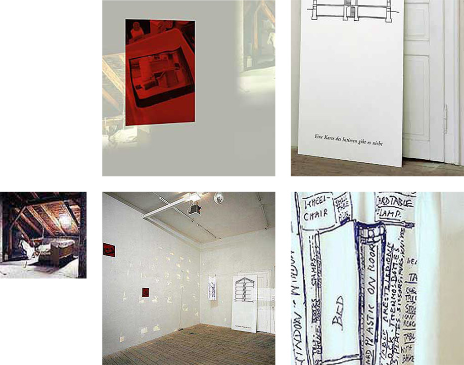 Wooden model of showcase, videomonitor. D.U.R.E.R., Animation film, based on Draughtsman Drawing a Recumbent Woman, woodcut by Albrecht Dürer. Photomontage based on early promotional photo of Marlene Dietrich. Rotating Photo slide projection of an attic situation. Photographic prints depicting different home-like situations in public space. Silkscreen on silken nightdress representing a floor plan of the last apartment of Marlene Dietrich as drawn by herself and published in her autobiography. Section drawing of a house quoting "A map of the Intimate does not exist" from: The Poetics of Space by Gaston Bachelard. |