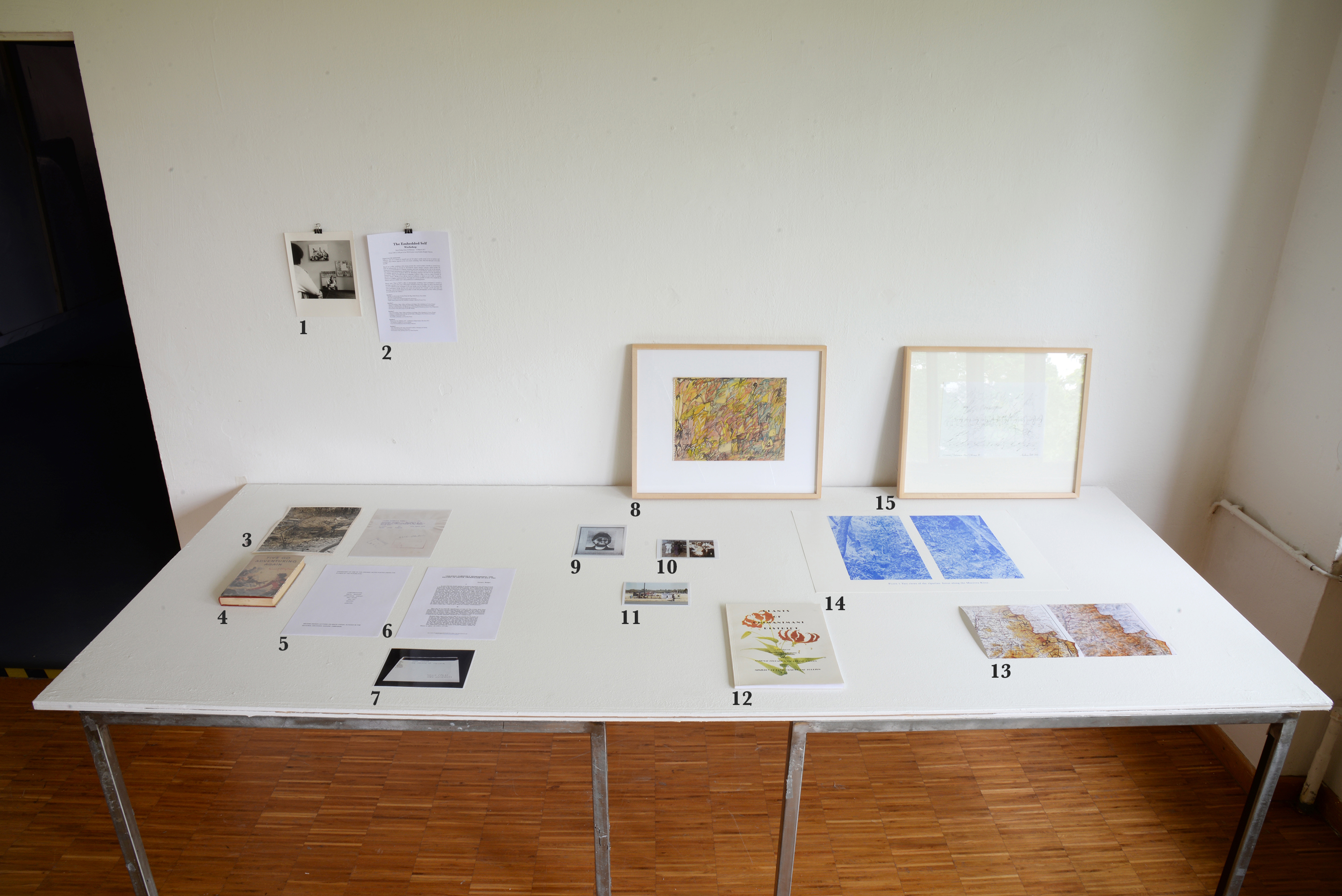 //1// Talent Kapadza, painter from Bulawayo, participant in the workshop The Embedded Self, photo: A. Wutz. //2// The Embedded Self, description of the workshop, which was offered as part of the Echoing Silences project at the National Gallery of Zimbabwe in Bulawayo. //3// Press photo that shows a destroyed or abandoned camp of freedom fighters. Zambezi river valley, 1968. //4// Five Go Adventuring Again (1943), bestseller by the British children's book author Enid Blyton. According to a police report, the novel was found in a suitcase in a shelter in Mutare, where the Crocodile Gang had spent a few nights before their attack in Chimanimani. (see essay by T. O. Ranger). //5// Transcript of a warning of the Crocodile Gang written on a piece of paper, which according to the police report was found under stones of the roadblock built at the crime scene close to Chimanimani. Source: National Archives, Harare. //6// Essay by the historian Terence Osborne Ranger (1929-2015) on the different narratives and interpretations of the first deadly attack by the Crocodile Gang on a mountain road near Chimanimani (formerly Melsetter) on 4 July 1964 (see Library). //7// Microfilm of the dissertation The prison of colonial space: narratives of resistance by Yvonne Vera, York University, Toronto 1995. Photo: A. Wutz //8// Rashid Jogee, Untitled, Watercolor, 2017. //9// Rashid Jogee, Self Portrait, Charcoal Drawing, 1979. Photo: A. Wutz. R. J., painter from Bulawayo, was a medic of the Rhodesian army and at the same time a sympathizer of the liberation struggle. (see video hall). //10// Virginia Phiri, musician, circa 1973. V. Phiri was a member of the Liberation Army ZIPRA. (see photo and text My Objects Tells / The Copper Necklace). //11// Oliver Mtukudzi, concert announcement, Harare, 2008. (see photo and text My Objects Tells / The Record Single). //12// plants in Chimanimani district, multilingual (see photos of Invisible Landscape). //13// Map of the district of Chimanimani, Zimbabwe (formerly Melsetter, Rhodesia, right picture). //14// A botanist in the riparian forest along the Mucrera River, Chimanimani Mountains, 1972 (picture from the botanical journal Arnoldia, picture edited by A. Wutz). //15// Andreas Wutz, Ekoneni, pencil on paper, 2017. Ekoneni is the Ndebele word for 'street corner', an important meeting point in the urban environment of Bulawayo that offers space for communication, business and leisure (see Yvonne Vera's novel The Stone Virgins in the exhibition library). The drawings of the series Ekoneni translate the visual impression of different street corners in Bulawayo in visual notations.
