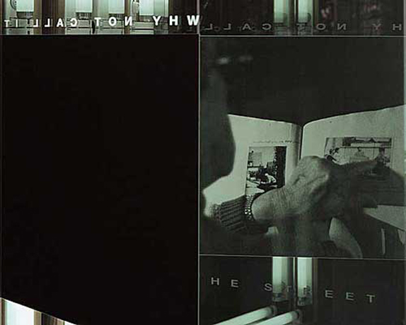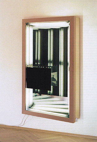 Wooden frame 171 x 96,4 x 20 cm/ 67 3/8 x 38 x 7 ¾ inches, sandblasted typography on one-way mirror, looking glass, fluorescent tubes